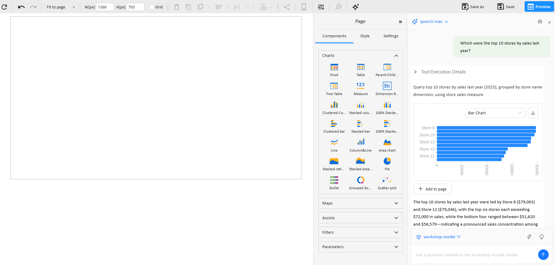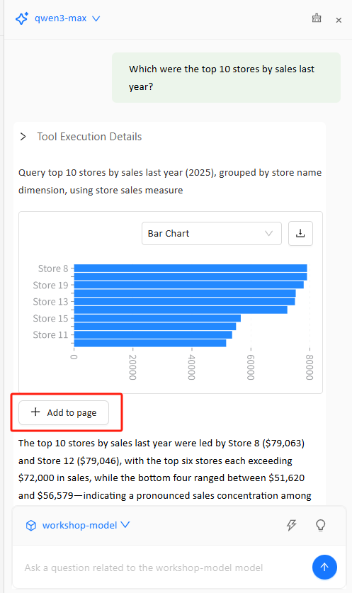 - One-click chart creation and placement: Add the chart returned in the conversation directly to the dashboard page via Add to page.