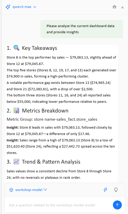 - Conversational query: Ask questions in natural language (e.g., “Which were the top 10 stores by sales last year?”) to quickly get results and visual charts.