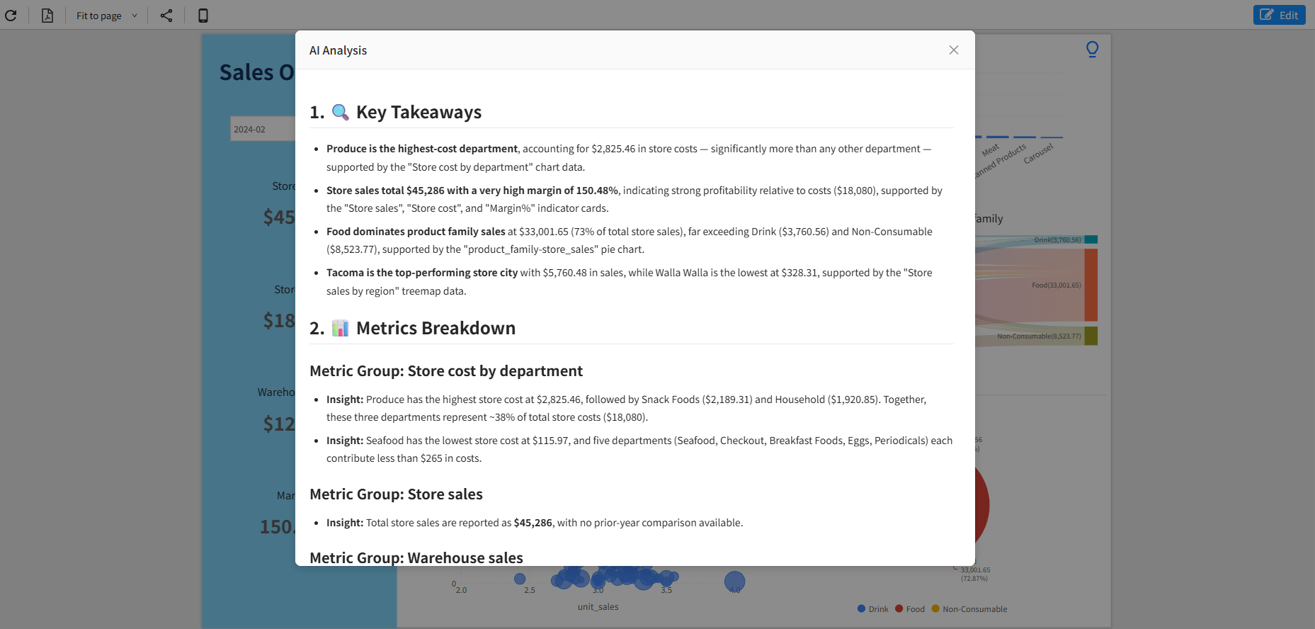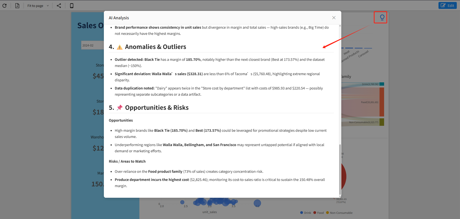 In Preview mode, when a user clicks the Insight button, the system automatically collects data from all visible charts on the dashboard and sends it to the AI model. The AI then generates a structured and professional insight report.